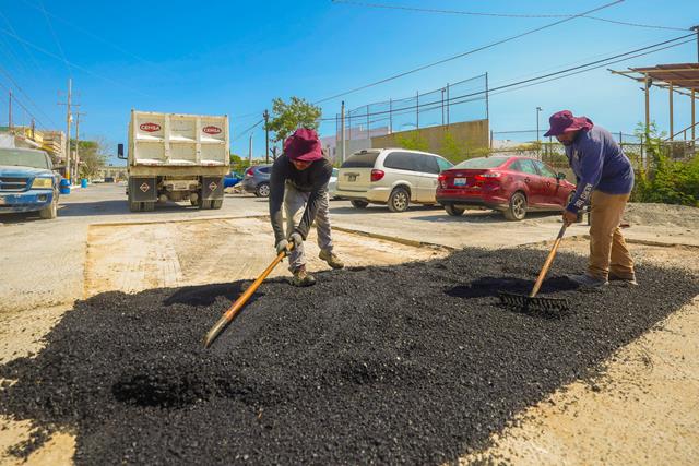 Desde temprana hora, un amplio grupo de trabajadores de las cuadrillas del R. Ayuntamiento laboran con mucha dedicación en el chapoleo, raspado, barrido y bacheo de calles, para devolver el buen aspecto al sector y la seguridad en la infraestructura a sus habitantes.
