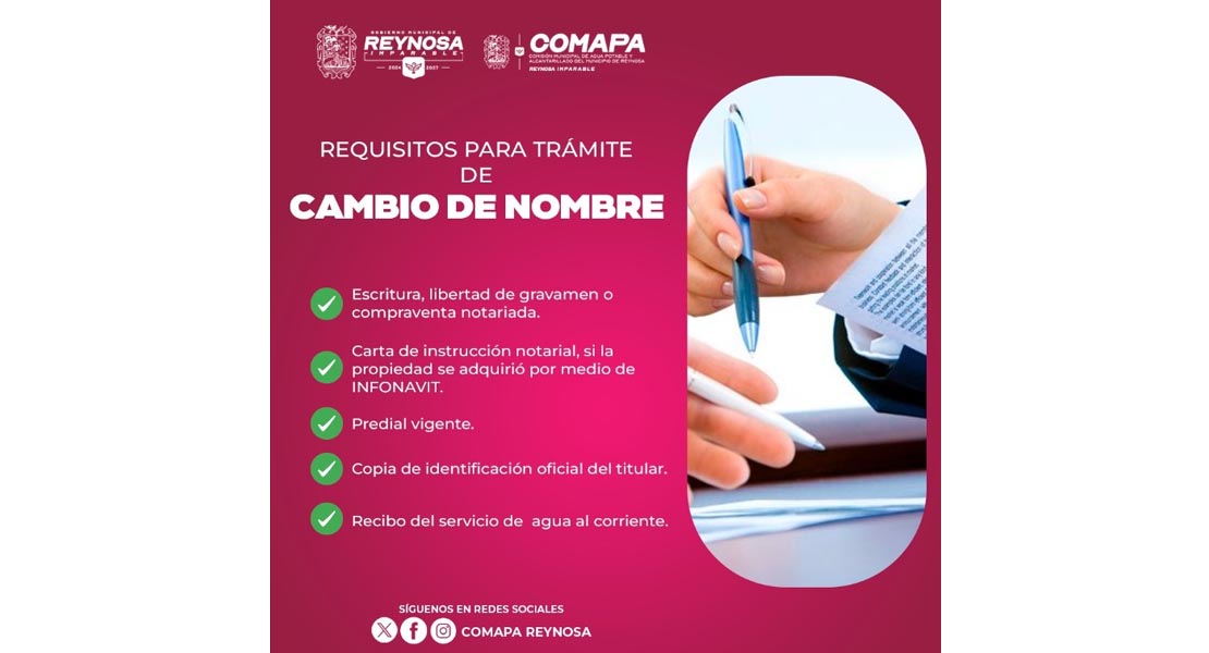 Reynosa, Tam.- La Comisión Municipal de Agua Potable y Alcantarillado de Reynosa pone a disposición de la ciudadanía los requisitos necesarios para llevar a cabo el trámite de cambio de nombre en el recibo de agua potable, con el objetivo de facilitar a los usuarios la actualización de sus datos y mantener en orden la titularidad del servicio.