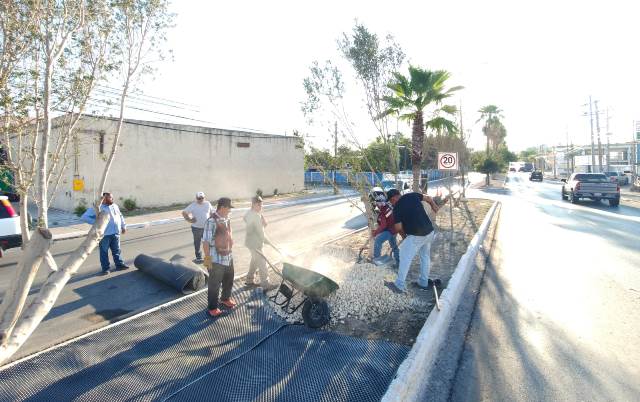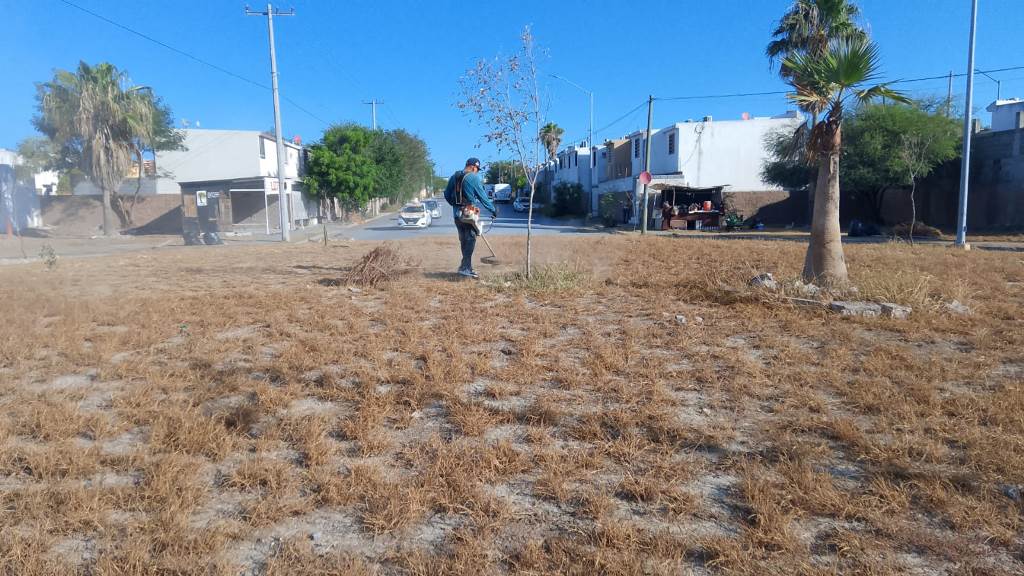 Este día las cuadrillas de la Secretaría de Servicios Públicos trabajan en el embellecimiento del bulevar Del Maestro; corte de maleza en calles y área verde en la colonia Hacienda Las Fuentes, así como lavado del puente Jarachinas en el libramiento Monterrey-Reynosa.