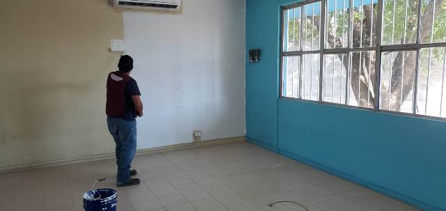 Se continúa con el apoyo de personal para el pintado de aulas en el jardín de niños María E. Pereira, ubicado en la calle Hawai con prolongación Londres, de la colonia Cañada.