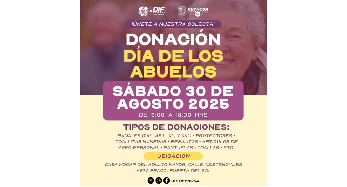 Reynosa, Tam.- Con el propósito de celebrar y reconocer la importancia de los adultos mayores en la sociedad, el Sistema DIF-Reynosa que preside Carlos Luis Peña Garza, invita a la ciudadanía, empresarios y agrupaciones de la sociedad civil, a sumarse a la colecta del Día de los Abuelos, que se llevará a cabo este sábado 30 de agosto, en un horario de 9:00 de la mañana a 6:00 de la tarde.