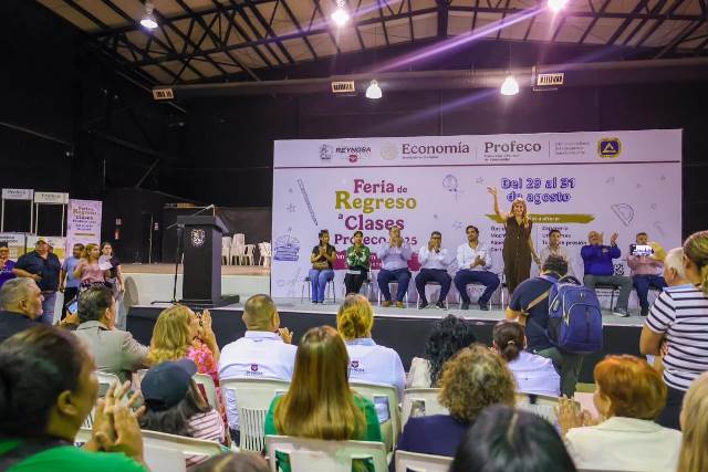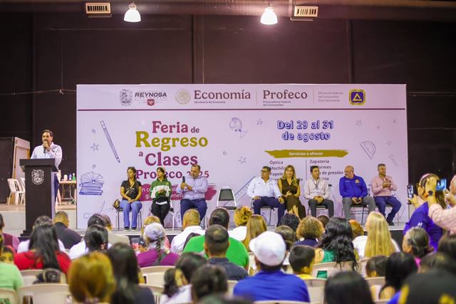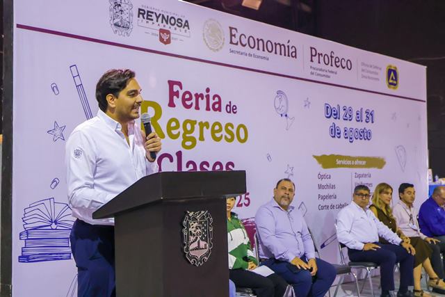 Reynosa, Tam.- La Feria de Regreso a Clases 2025 organizada por la PROFECO en coordinación con el Gobierno Municipal de Reynosa y la Cámara de Comercio, fue inaugurada por el Alcalde Carlos Peña Ortiz, con la participación de la Senadora de la República, Doctora Maki Esther Ortiz Domínguez y de José Luis Márquez Sanchez, Director de la Oficina de la Defensa del Consumidor.