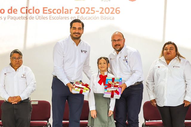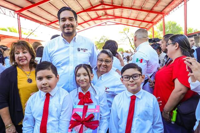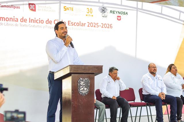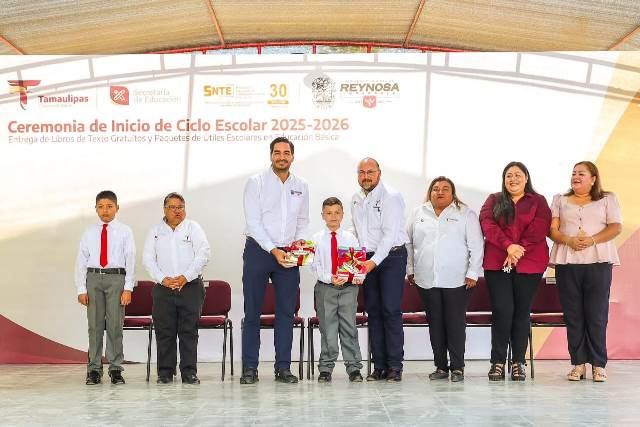 Reynosa, Tam.- El Presidente Municipal Carlos Peña Ortiz, acompañó al Secretario General del Gobierno del Estado, Héctor Joel Villegas González, representante del Gobernador Constitucional de Tamaulipas, Doctor Américo Villarreal Anaya, en la Ceremonia de Inicio de Ciclo Escolar 2025-2026 y Entrega de Libros de Texto Gratuitos y Paquetes de Útiles Escolares en Educación Básica en la escuela primaria Lauro Aguirre de la colonia Benito Juárez.