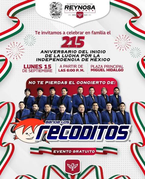 Reynosa, Tam.- La celebración de los 215 años del Inicio de la Lucha por la Independencia de México estará enmarcada con grandes estrellas, disfruta la gran noche del 15 de septiembre del estupendo show musical de la Banda Los Recoditos.