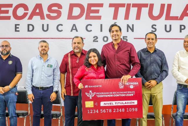 Reynosa, Tam.- El Presidente Municipal Carlos Peña Ortiz cumplió una etapa importante del Programa de Becas Más Grande en la Historia de Reynosa, entregando las Tarjetas que apoyan la Titulación, a los jóvenes Luis Ramírez Morgado y Janet Nayely García egresados del Centro de Estudios Universitarios José Vasconcelos, como representantes de todos los beneficiarios.