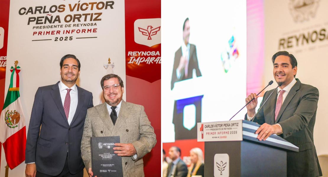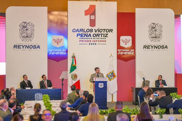 Reynosa, Tam.- El Presidente Municipal Carlos Peña Ortiz presentó el Primer Informe de su Gobierno, con la presencia del Secretario de Educación, Miguel Ángel Valdez García, representante del Gobernador Constitucional de Tamaulipas, Doctor Américo Villarreal Anaya.