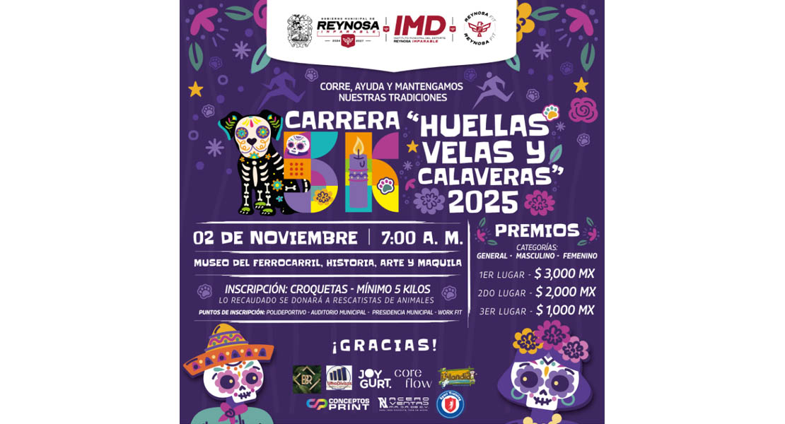 Reynosa, Tam.- El Alcalde Carlos Peña Ortiz, invita a la ciudadanía a participar en la carrera 5K con causa Huellas, Velas y Calaveras 2025, que se llevará a cabo el próximo 2 de noviembre a las 7:00 de la mañana, partiendo del Museo del Ferrocarril, Arte y Maquila.