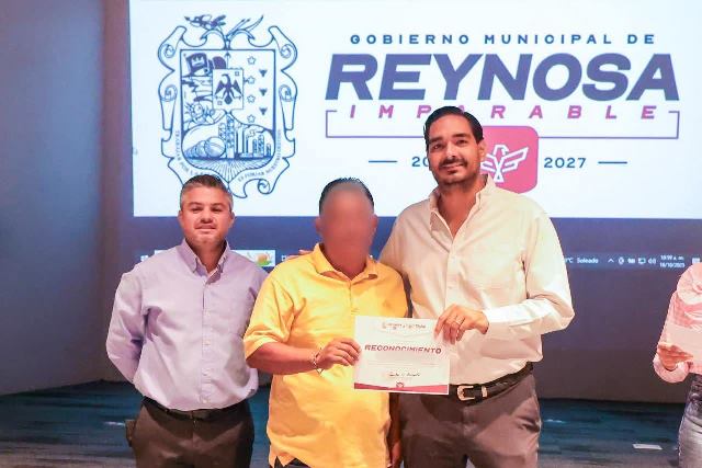 Reynosa, Tam.- El Presidente Municipal Carlos Peña Ortiz, acompañado por la campeona mundial de box Mariana «La Barbie» Juárez, entregó reconocimientos a una nueva generación de egresados del programa social Tazo Dorado, que impulsa una nueva vida con más oportunidades para quienes sufre de problemas de adicción.