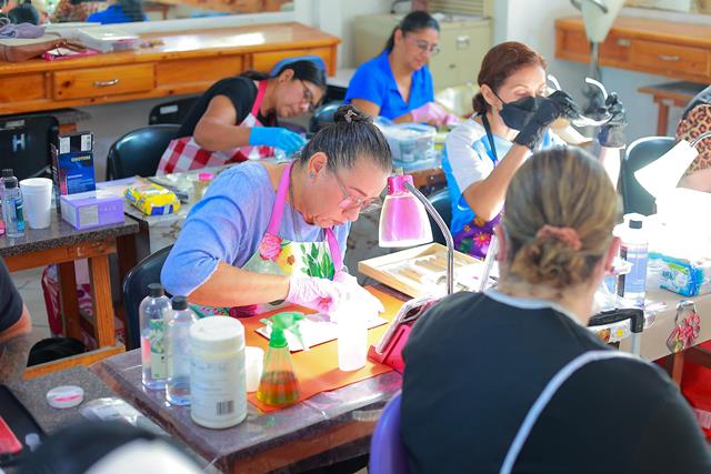 Entre las opciones formativas se encuentra el taller de resina epóxica, una alternativa que permite a las participantes transformar su talento en oportunidades de emprendimiento, generando productos creativos como llaveros, fundas para celulares, plumas, aretes, collares, anillos y más, que con la capacitación pueden ir mejorando la técnica y creando más productos.