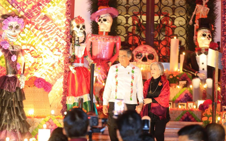 Ciudad Victoria, Tamaulipas.- En un ambiente impregnado por el aroma de la flor de cempasúchil, el pan de muerto y las luces de las velas, el gobernador Américo Villarreal Anaya y la presidenta del Sistema DIF Estatal, María de Villarreal presidieron la premiación del concurso estatal de catrinas y catrines «Almas Tamaulipecas» y la muestra del altar monumental del Día de Muertos en las escalinatas de Palacio de Gobierno .