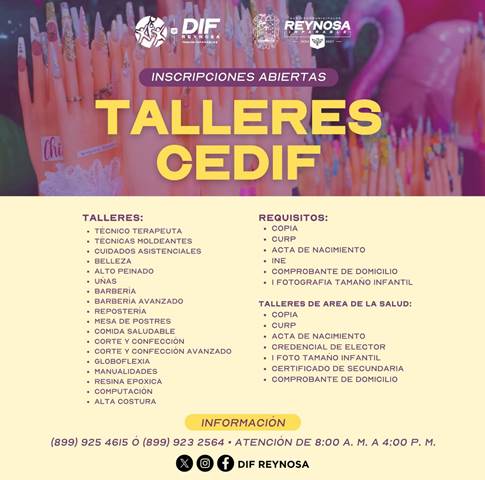 Reynosa, Tam.- A fin de impulsar el aprendizaje y el emprendimiento, el Sistema DIF-Reynosa, que preside Carlos Luis Peña Garza, invita a la ciudadanía a formar parte de los talleres CEDIF.