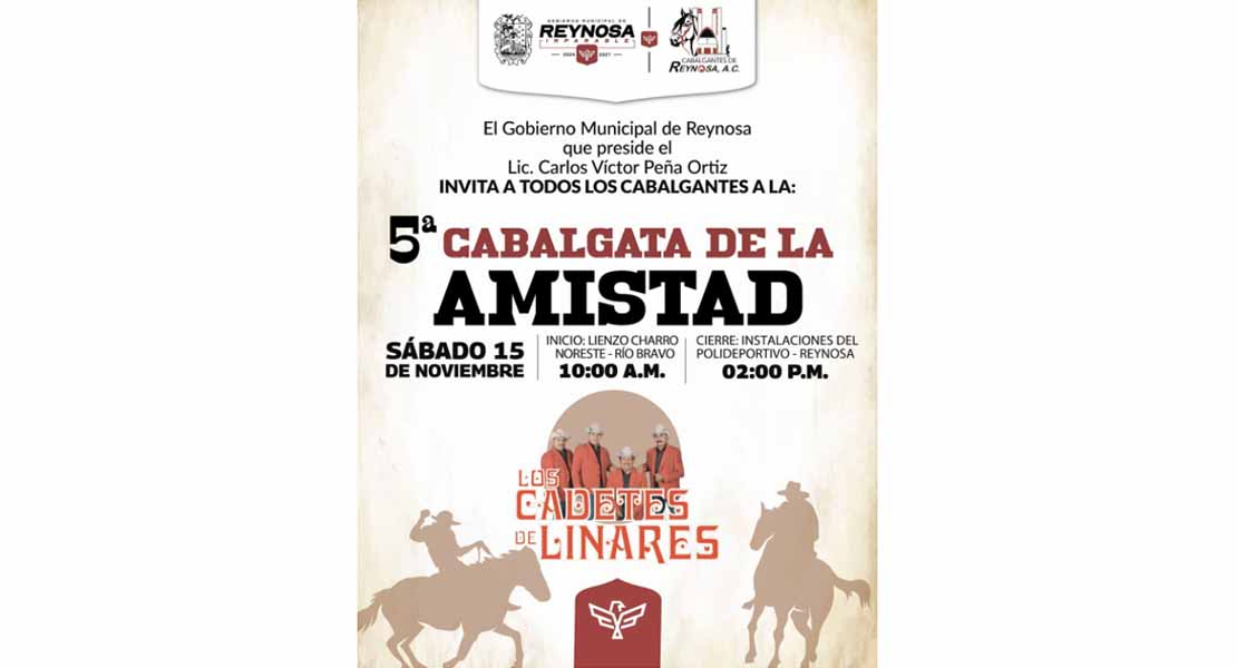 Reynosa, Tam.- El Gobierno Municipal de Reynosa, que encabeza el Alcalde Carlos Peña Ortiz, invita a todas y todos los cabalgantes a la Quinta Edición de la Cabalgata de la Amistad, celebrando la tradición y el orgullo del Norte de Tamaulipas.