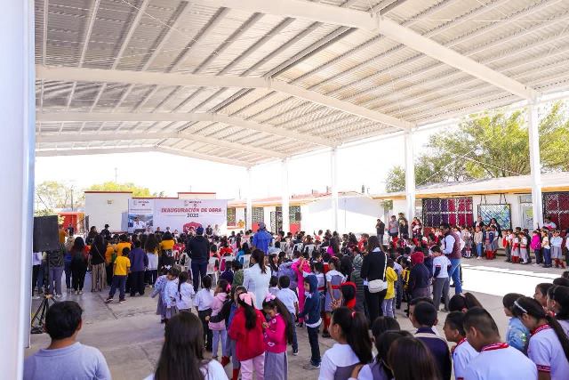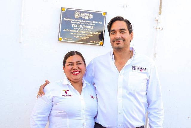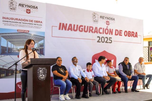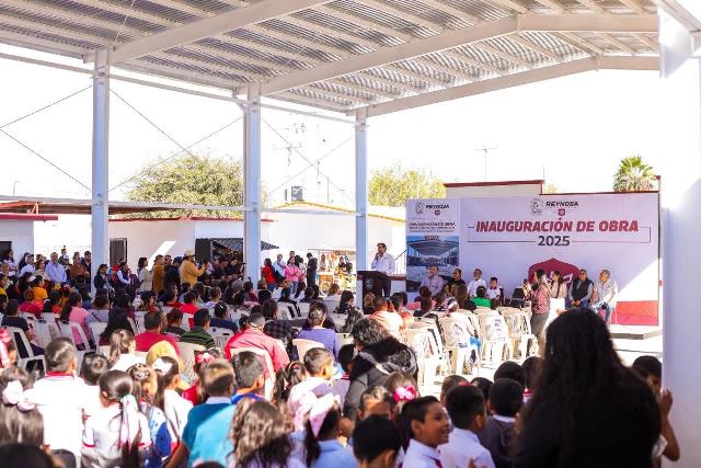 Reynosa, Tam.- «Estamos de fiesta el día de hoy con los padres de familia, inaugurando esta techumbre para que los niños y niñas de esta noble institución puedan llevar a cabo sus actividades sin importar el solazo que tenemos aquí en esta región del norte de Tamaulipas», dijo con entusiasmo el Alcalde de Reynosa, Carlos Peña Ortiz, quien además anunció la pavimentación de una calle lateral a la escuela primaria Julián Ernesto Zamora Rivas, de la colonia Villa Esmeralda.