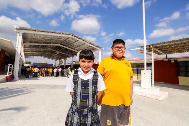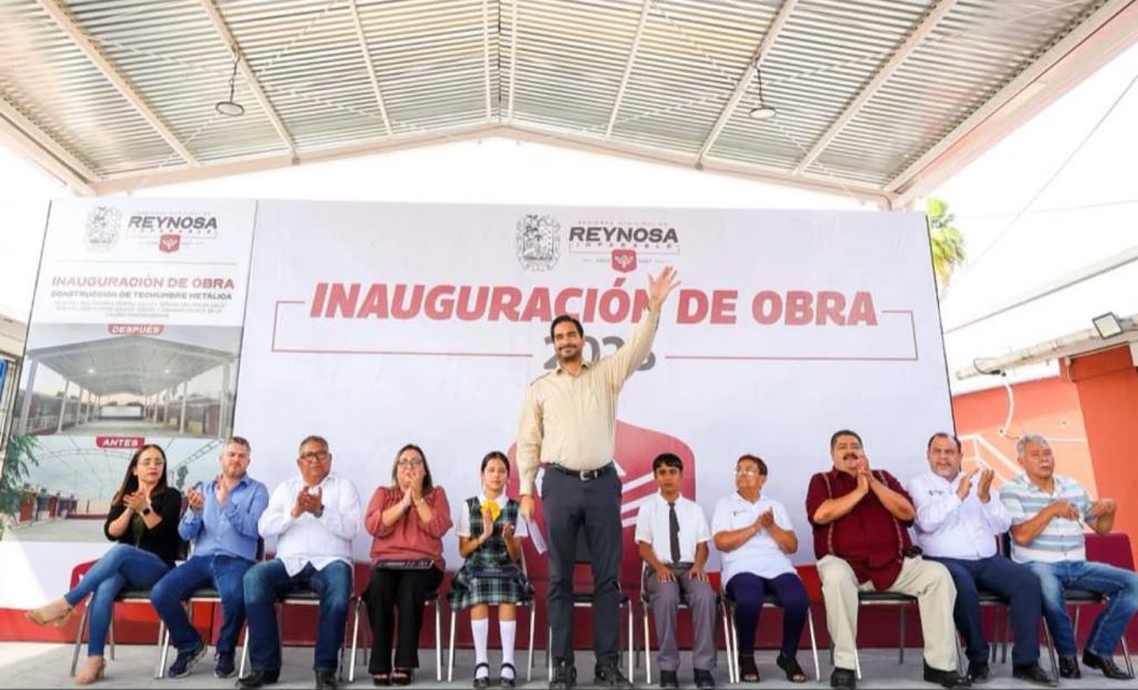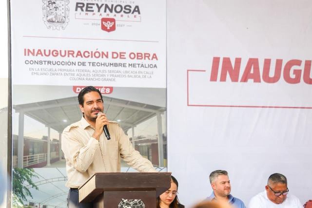Reynosa, Tam.- Inaugurando la Techumbre Metálica en la escuela primaria Aquiles Serdán, de la colonia Rancho Grande, el Presidente Municipal Carlos Peña Ortiz, fue recibido por la Directora Wendy Roxana Castro Lores y los alumnos Briana Camila González Cruz y David Alarcón Rincón.