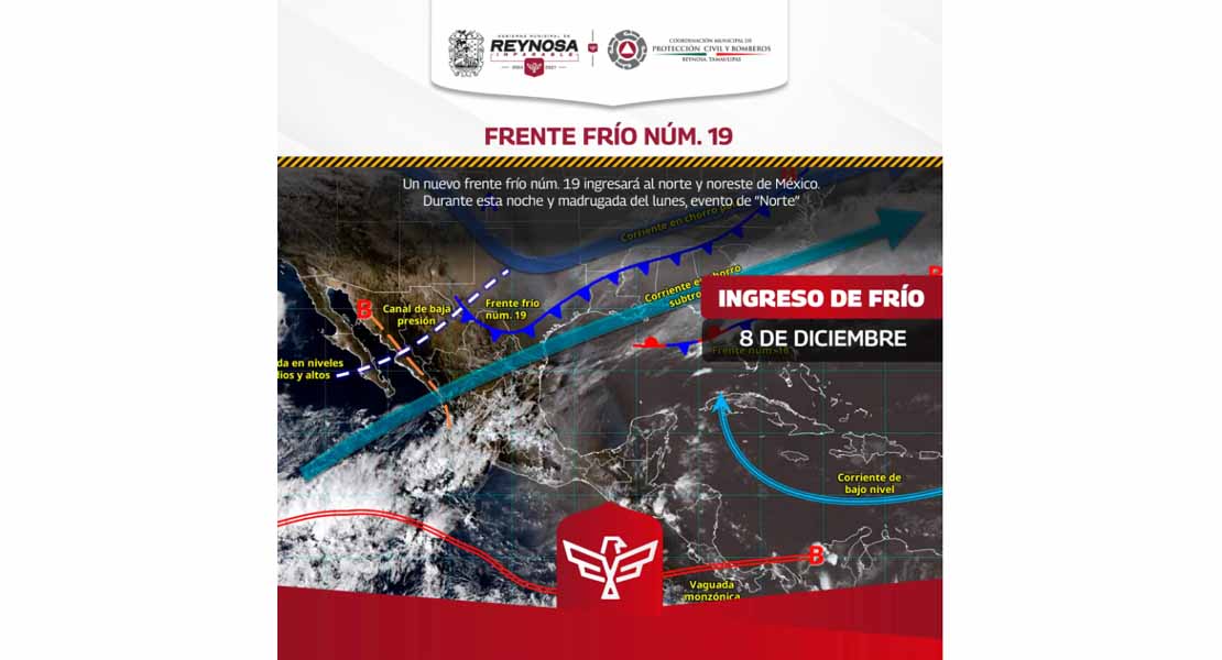 Reynosa, Tam.- La Coordinación de Protección Civil y Bomberos del Gobierno Municipal de Reynosa comparte información meteorológica para etapa región, que indica la llegada del Frente Frío Número 19, el cual traerá un notable descenso en la temperatura ambiente para Reynosa con mínima probable de 8° Centígrados para esta noche de domingo 7 y primeras horas de lunes 8 de diciembre.