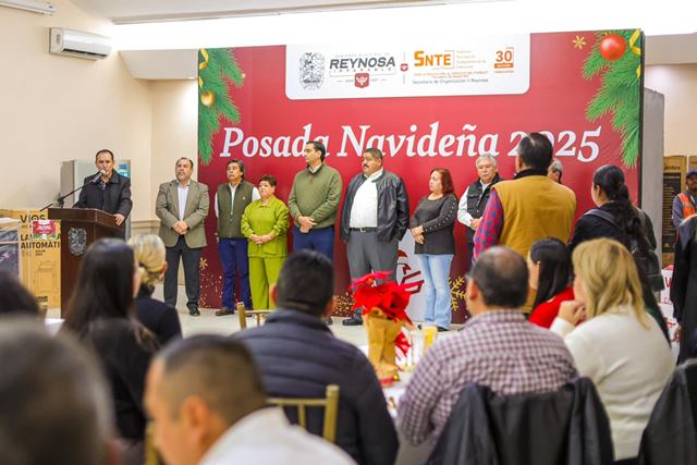 Reynosa, Tam.- El magisterio reynosense convivió con el Alcalde Carlos Peña Ortiz como su invitado especial en la Posada Navideña de la Secretaría de Organización II del SNTE, a la que convocaron los Maestros Jorge Guadalupe Acuña Tovías y José Iram Rodríguez Limón.