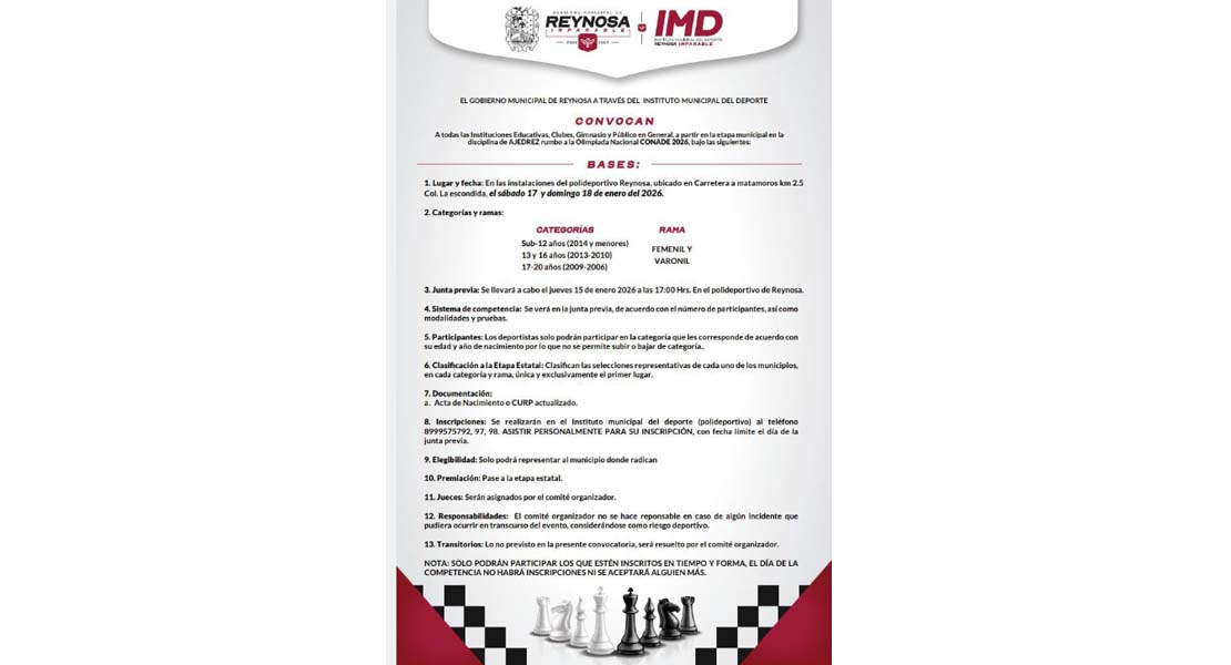 Invita Gobierno de Reynosa a inscribirse en Torneo de Ajedrez