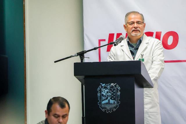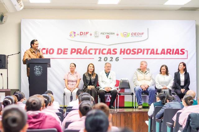 Reynosa, Tam.- El Presidente Municipal Carlos Peña Ortiz, dio un discurso para el inicio de las Prácticas Hospitalarias de más de 70 alumnos de Enfermería de los Centros CEDIF Hidalgo y Jarachina, en el Hospital General de Reynosa, HGR, con el Subdirector Felipe Alcalá Espinosa, y el Presidente del Patronato del DIF-Reynosa, Carlos Luis Peña Garza.