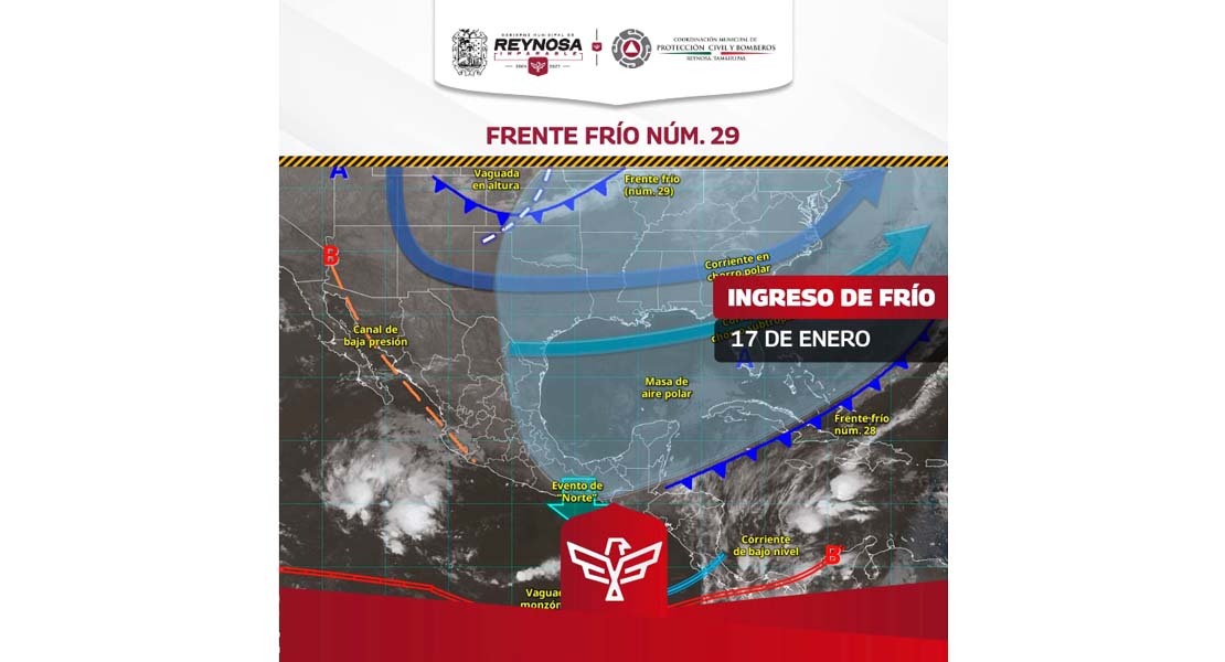 Reynosa, Tam.- El Gobierno Municipal de Reynosa informa que como efecto del Frente Frío Número 29, este sábado 17 de enero se podría registrar el descenso de la temperatura hasta entre 6° y 7° Centígrados, considerando que la máxima se situaría en 18°, con alta probabilidad de lluvia, de acuerdo a datos del Servicio Meteorológico Nacional.