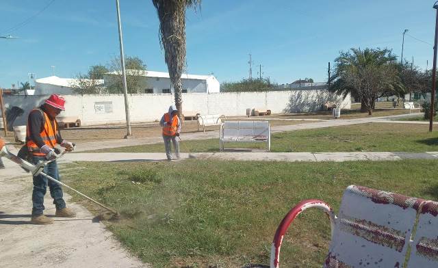 Esta mañana del lunes 26 de enero, cuadrillas de Servicios Públicos trabajan en el chapoleo y limpieza de la plaza de la colonia Antonio J. Bermudez, ubicada en bulevar Antonio J. Bermudez con Alvaro Obregón y Paseo de Los Pinos.