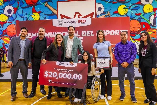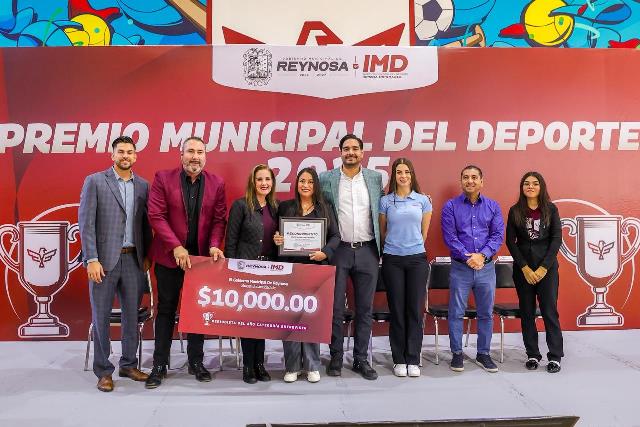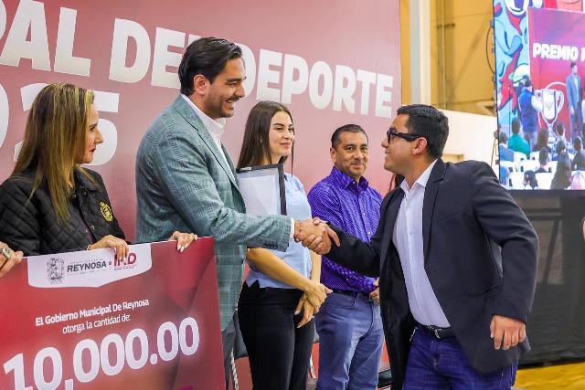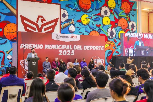 Reynosa, Tam.- El Alcalde Carlos Peña Ortiz entregó esta tarde el Premio Municipal del Deporte y Premio al Periodismo Deportivo 2025, un galardón que reconoce el esfuerzo, la dedicación, disciplina y honor de los atletas reynosenses y de los periodistas de la ciudad, evento que presidió acompañado por su esposa Alejandra Yelitza Garza, por la Diputada Federal Claudia Alejandra Hernández Sáenz y por el Director del Instituto Municipal del Deporte, Saúl Soto Castro.