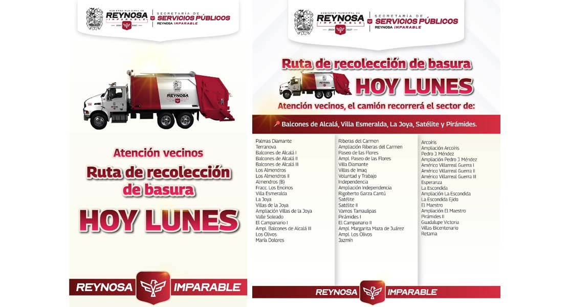 Reynosa, Tam.- El Gobierno Municipal de Reynosa reconfiguró el servicio de recolección de residuos domésticos, y pide a las familias disponer de sus depósitos y bolsas a tiempo, fuera de la propiedad, para el paso del personal por sus viviendas; te damos a conocer el recorrido de este lunes 9 de febrero por las diversas colonias.