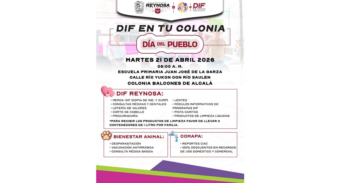 Reynosa, Tam.- El Sistema DIF-Reynosa que encabeza Carlos Luis Peña Garza, invita a las familias a participar en la brigada “DIF en Tu Colonia», que se realizará el próximo martes 21 de abril a partir de las 08:00 de la mañana, en la Escuela Primaria «Juan José de la Garza», ubicada en la colonia Balcones de Alcalá.