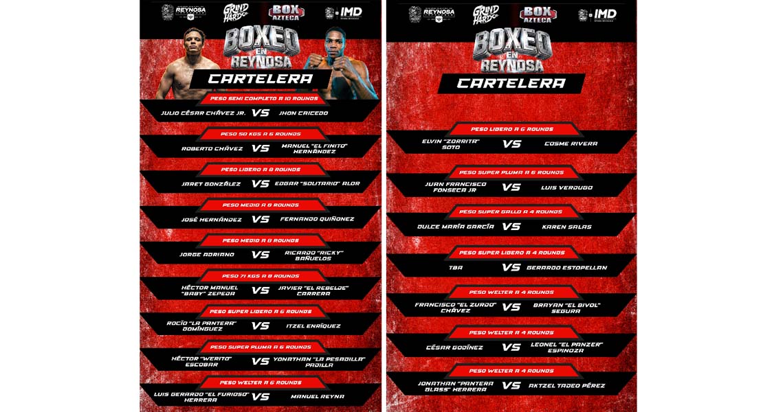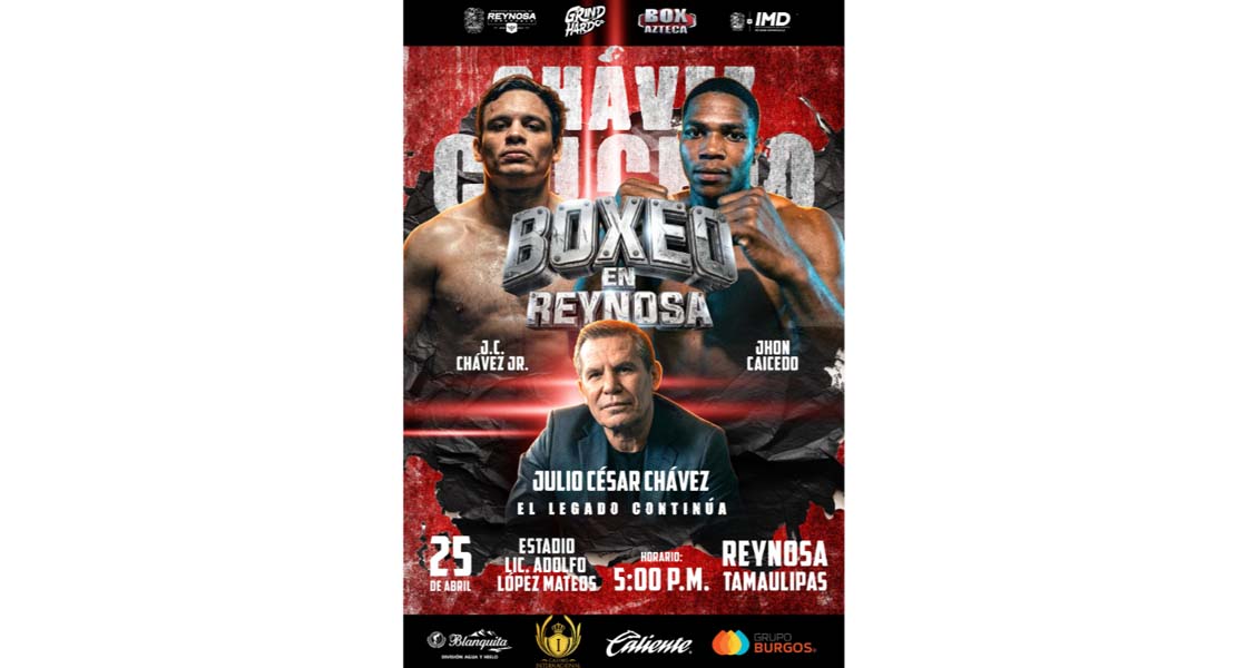 Reynosa, Tam.- El Presidente Municipal Carlos Peña Ortiz invita a los aficionados de Reynosa y del Valle del Sur de Texas a la función estelar de Boxeo Profesional del púgil mexicano Julio César Chávez Jr., quien el próximo 25 de abril subirá al ring para enfrentarse al colombiano Jhon Caicedo teniendo como escenario el majestuoso parque Adolfo Lopez Mateos, donde habrá 17 peleas más.