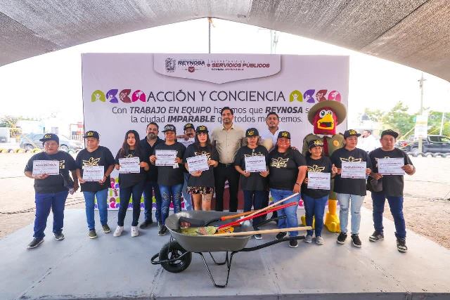 Reynosa, Tam.- El Presidente Municipal Carlos Peña Ortiz, fue recibido entre vivas y aplausos por las familias del fraccionamiento Halcón, durante el cierre del programa Acción y Conciencia desarrollado por Servicios Públicos con el objetivo de fortalecer la participación ciudadana y fomentar el cuidado de los espacios comunes.